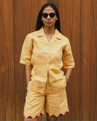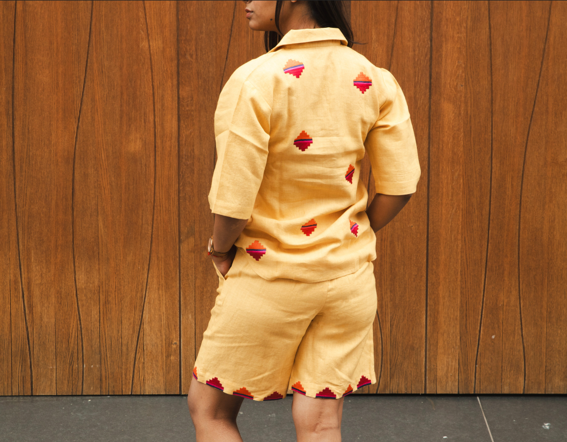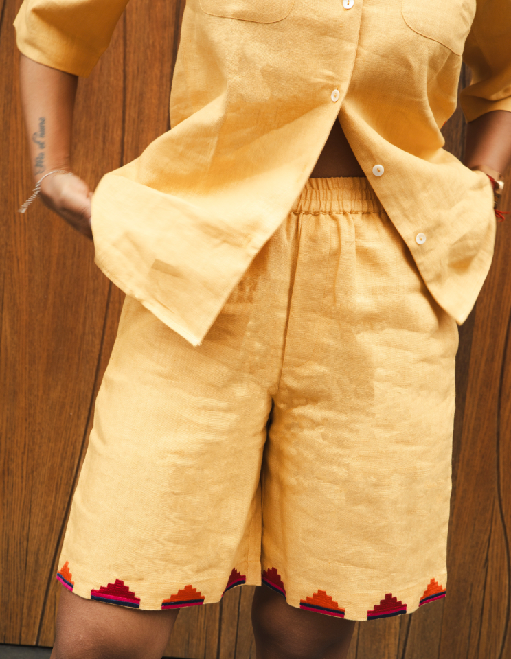 A playful yet timeless co-ord set in soft apricot, featuring a boxy shirt and relaxed bermuda shorts. The shirt showcases bold Ikkat-inspired embroidery at the back, while the shorts echo the design with a striking embroidered hemline. Finished with functional patch pockets, and breathable linen for all-day comfort. Wear them together for effortless summer style or mix and match with your wardrobe staples.
