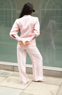These blush pink trousers are designed with both style and practicality in mind. Made from a soft matte linen, they offer a breathable, lightweight feel perfect for all-day wear. The wide-leg silhouette and high-waisted fit create a flattering, timeless shape, while the thoughtful addition of generously sized pockets sets them apart. Whether it's your phone, keys, or other daily must-haves, these pockets are deep and functional without adding bulk. The blush pink color adds a soft, modern touch, making these pants as versatile as they are comfortable.