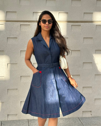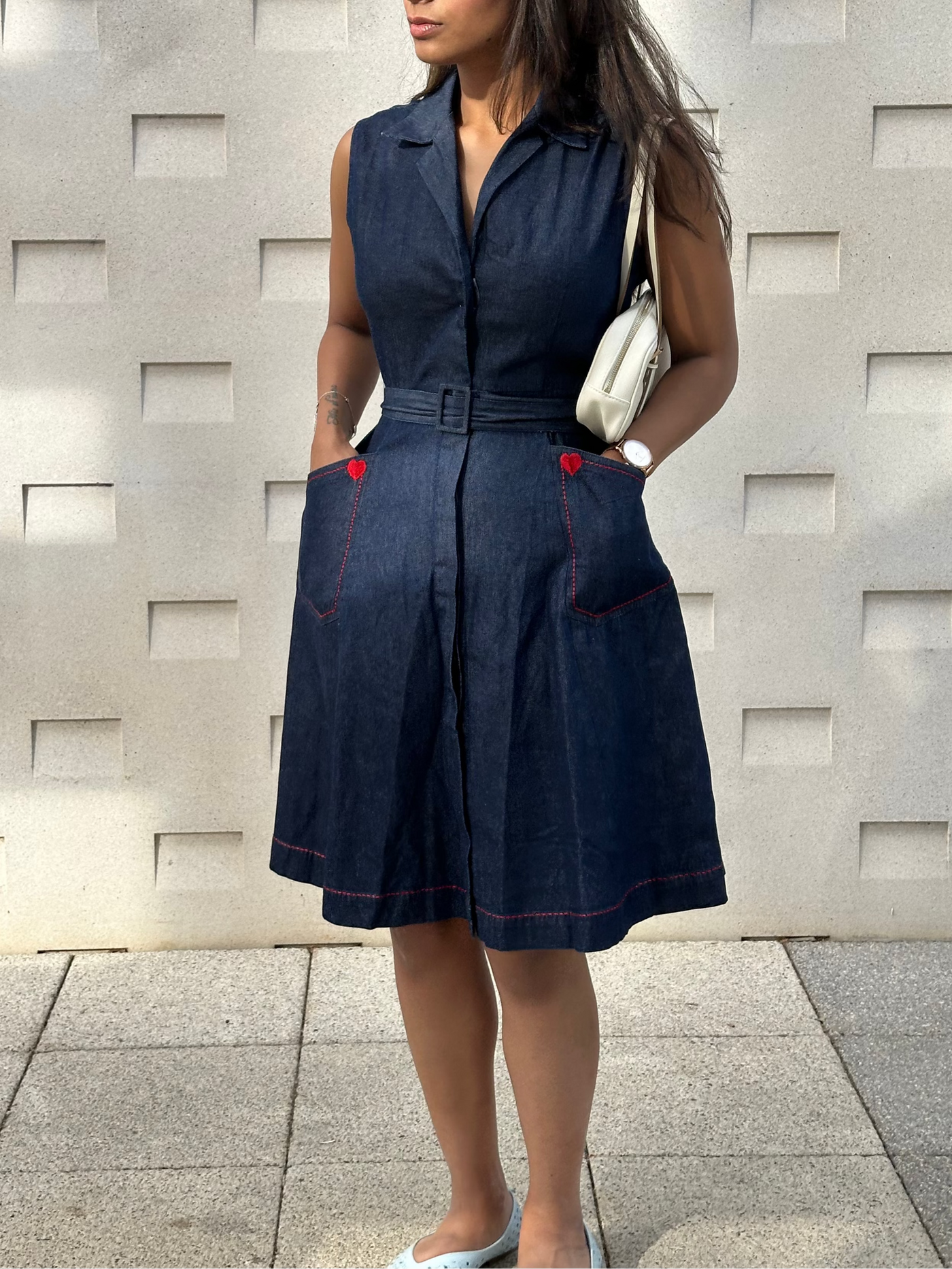 A playful take on classic denim, this sleeveless dress features a front button placket, patch pockets with red topstitching, and mini heart embroidery for a sweet touch. The flared, pleated skirt adds movement, while red topstitch details along the hemline tie the look together. Finished with a detachable belt to cinch the waist or wear loose for an easygoing vibe.